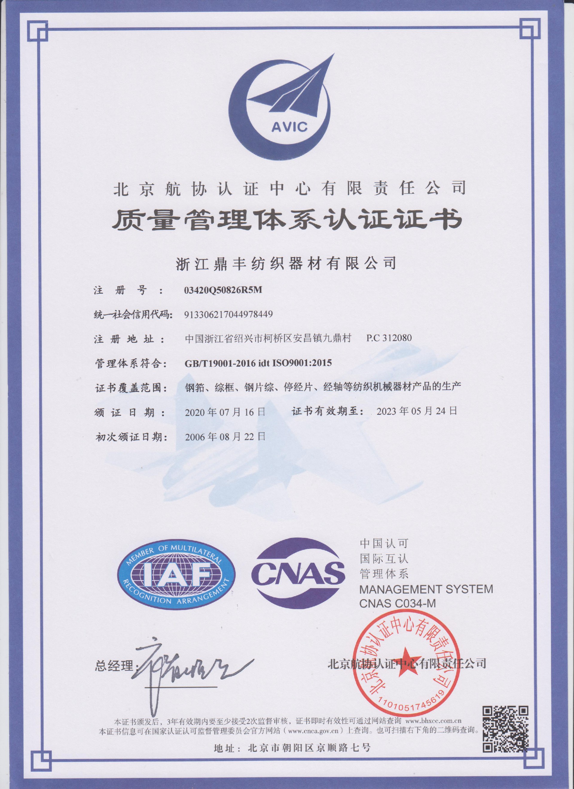 公司現(xiàn)有固定資產(chǎn)6000余萬元,員工300余人,現(xiàn)具有年產(chǎn)噴氣異型筘12萬米,劍桿筘32萬米,噴水筘5萬米,綜框20萬片,鋼片綜2億片,停經(jīng)片1.5億片, 織軸1.2萬套的生產(chǎn)能力。公司“越泉”商標被評為“中國馳名商標”。公司通過ISO9001 :2015國際質量體系認證,ISO14001:2015國際環(huán)境管理體系認證,ISO45001:2018國際職業(yè)健康安全管理體系認證,噴氣織機用鋼筘和織機用鋁合金綜框獲得“浙江制造”品牌認證,公司擁有自營進出口權,產(chǎn)品暢銷全國并遠銷印度、巴基斯坦、土耳其、埃及、哥倫比亞、意大利等國家和地區(qū)。